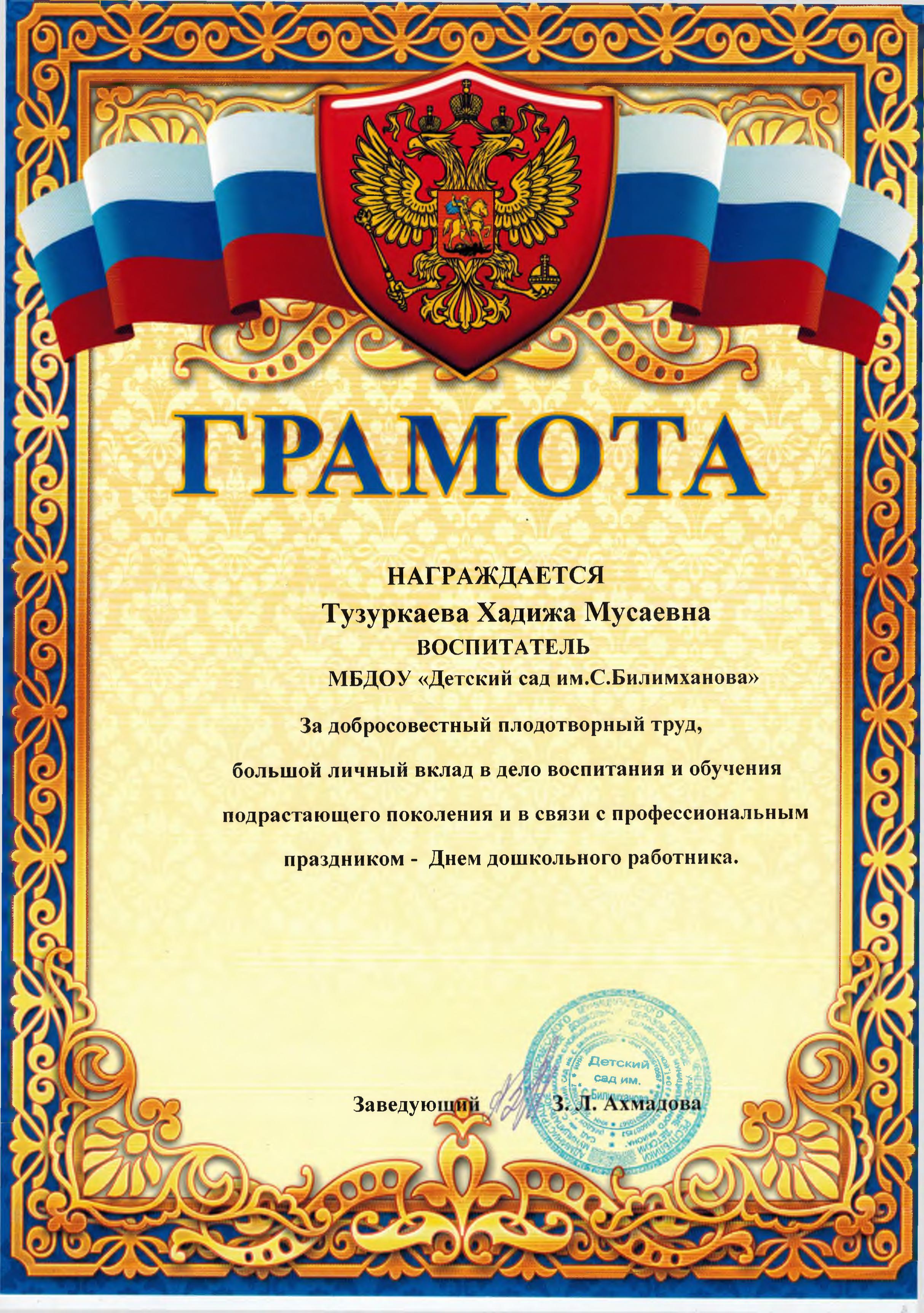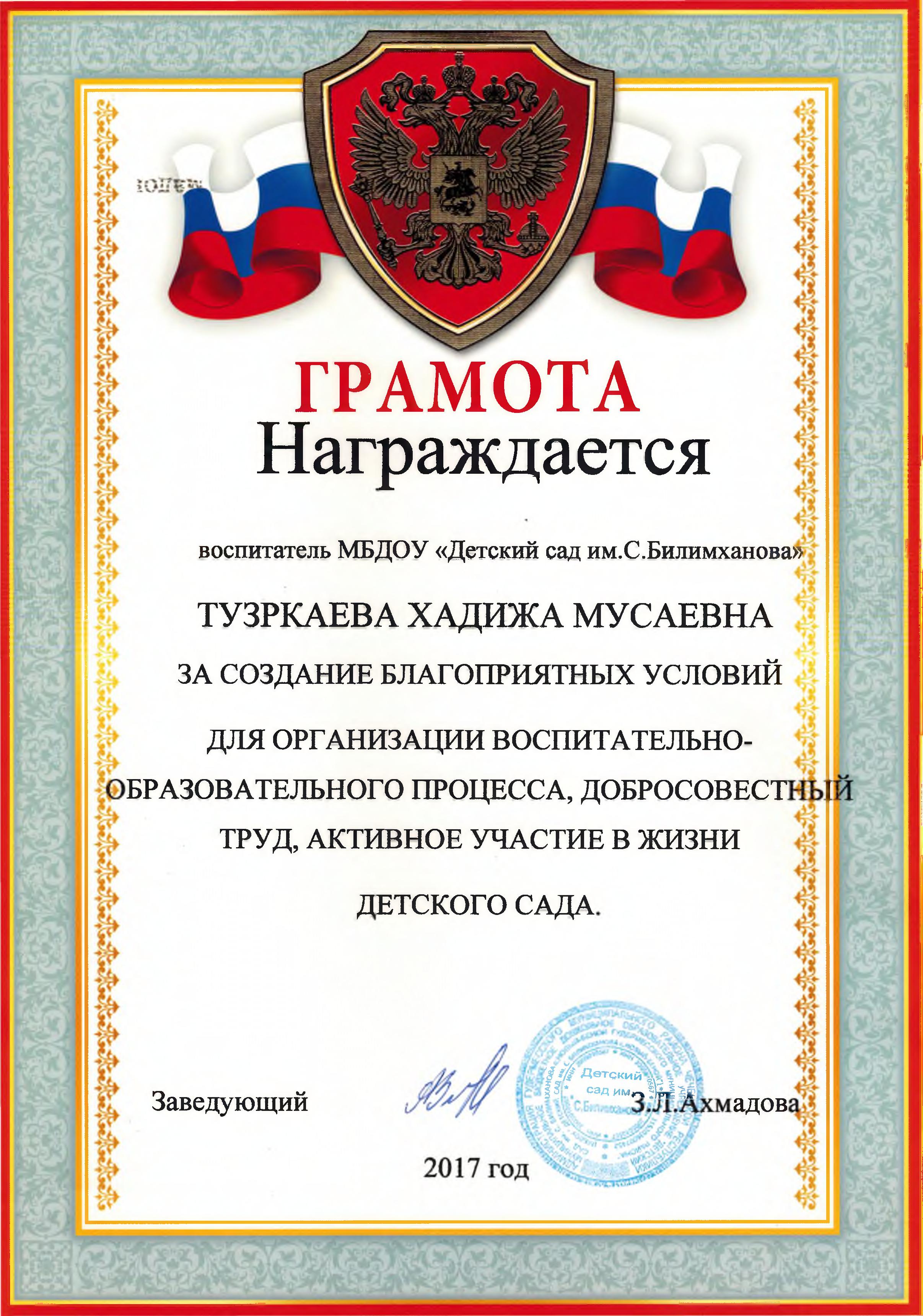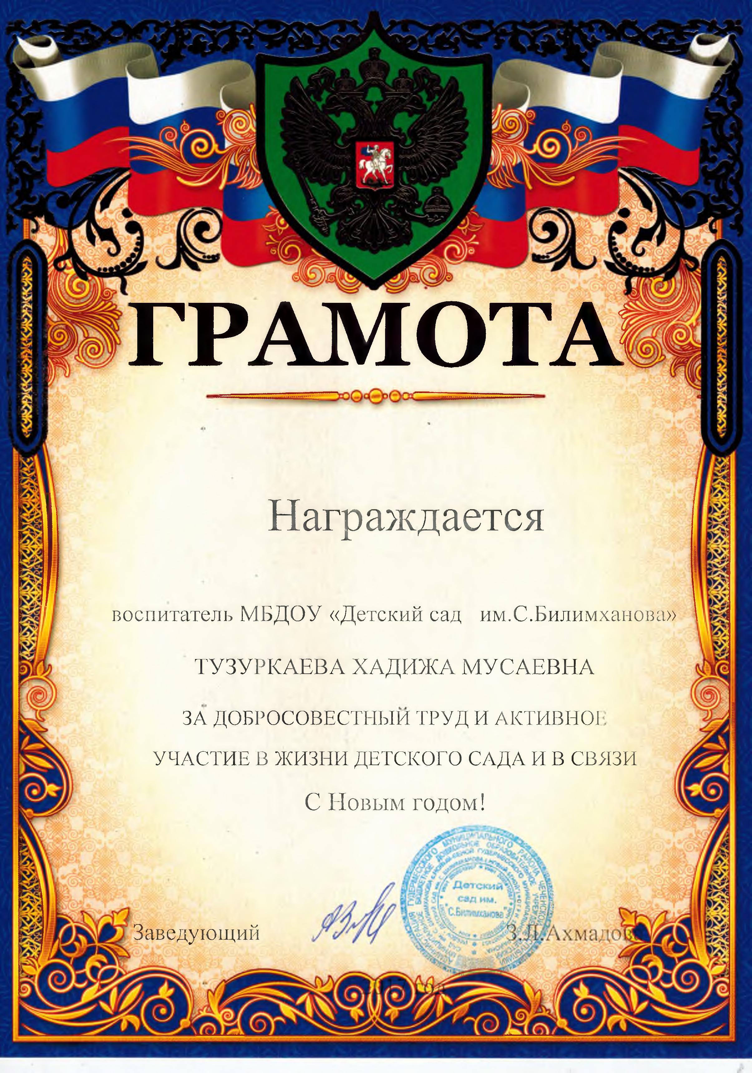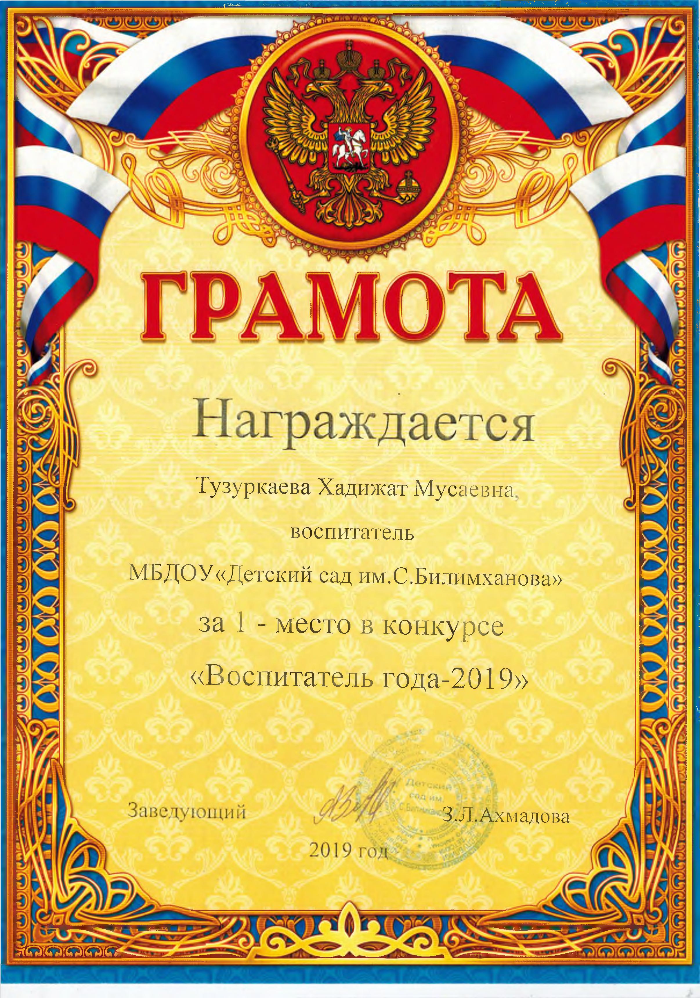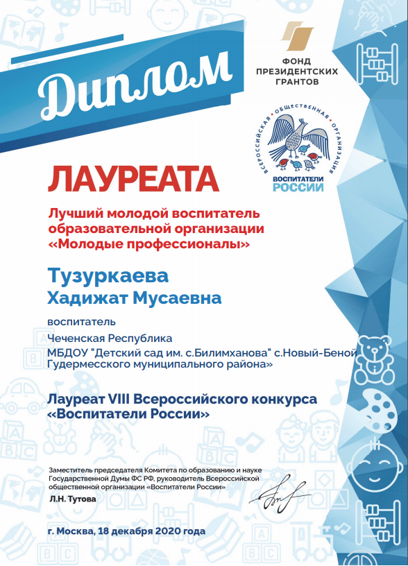 Районный конкурс «Воспитатель года-2021» Здравствуйте, уважаемые посетители нашего сайта. Я, Тузуркаева Хадижат Мусаевна, воспитатель МБДОУ "Детский сад им. С.Билимханова" с. Новый-Беной Гудермесского района. Добро пожаловать на мою страничку!