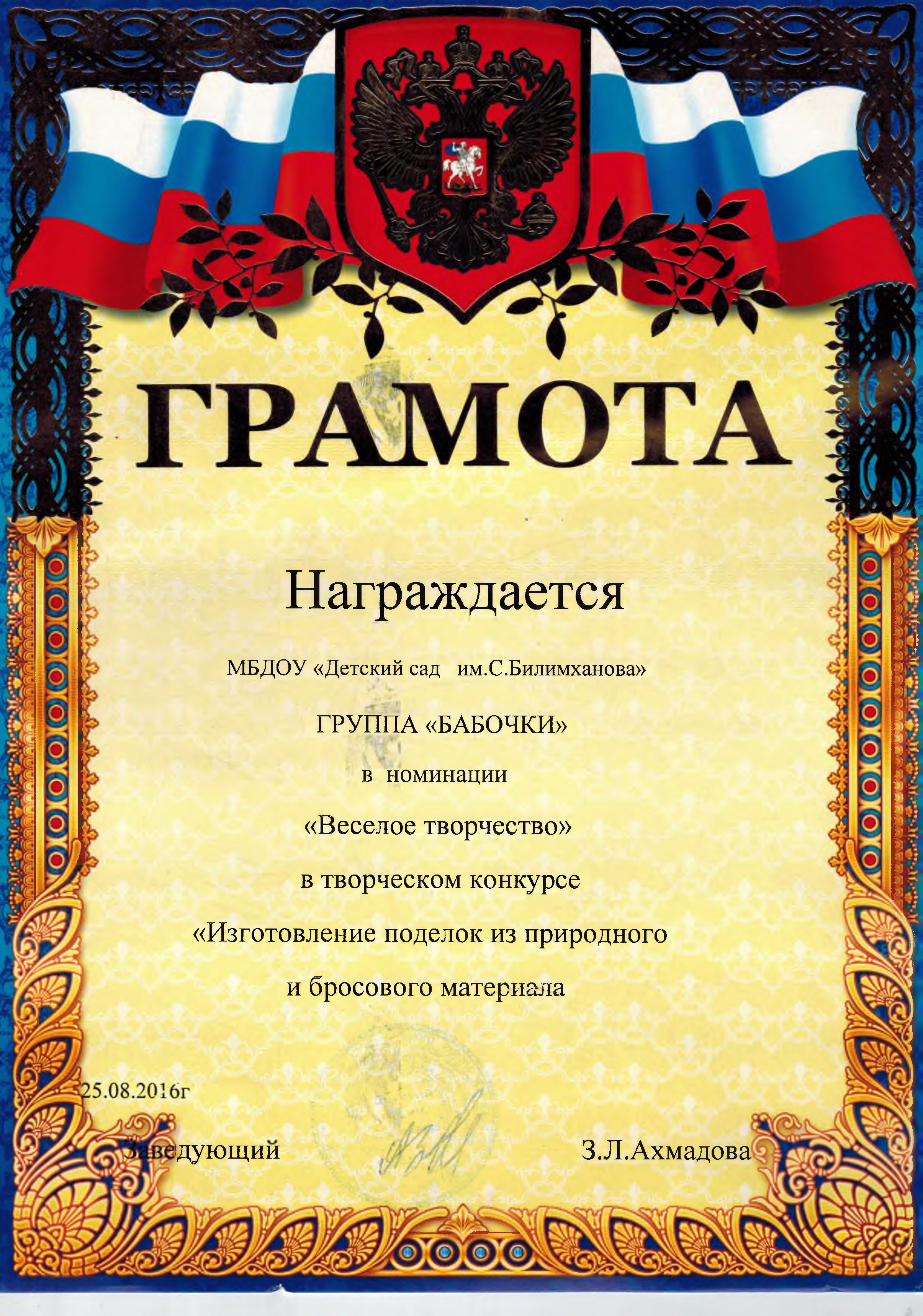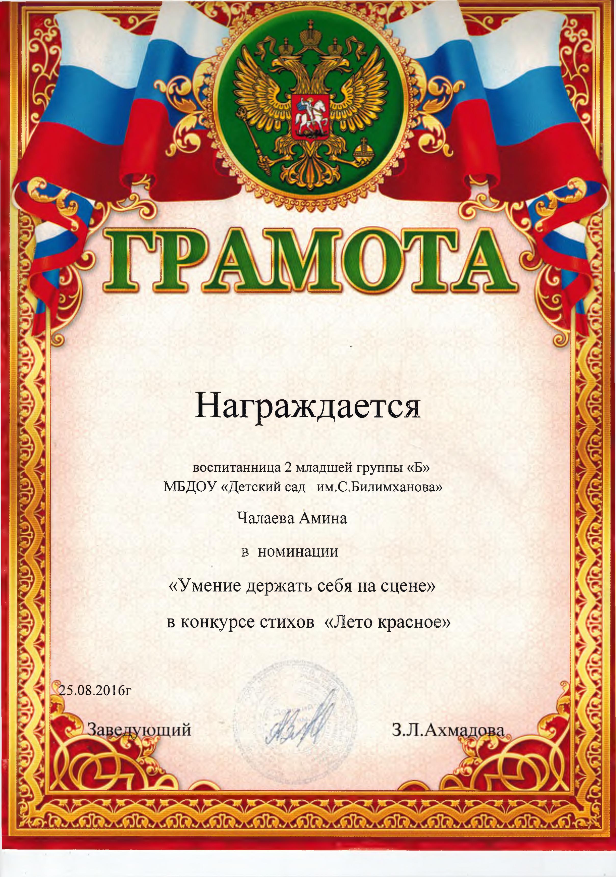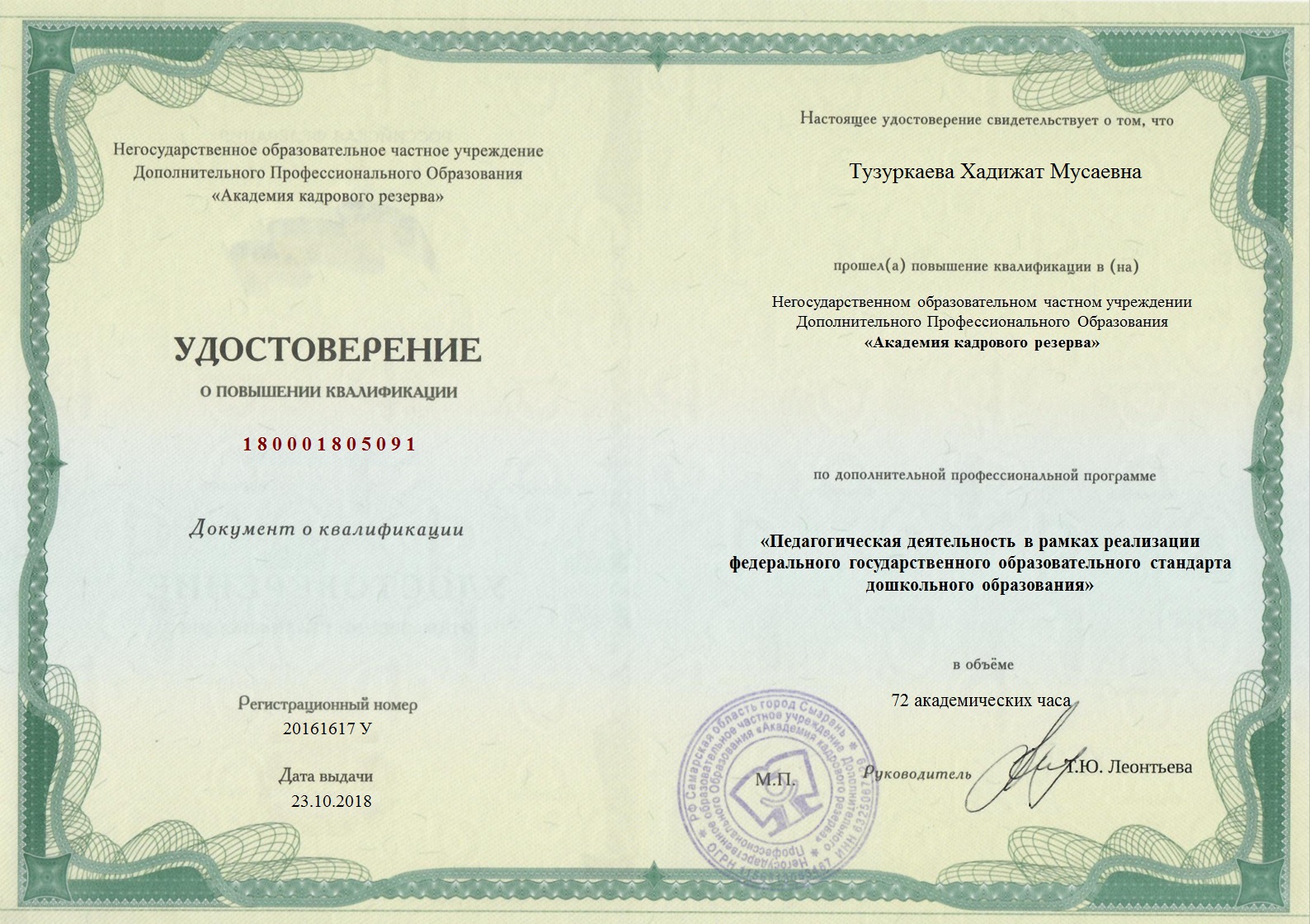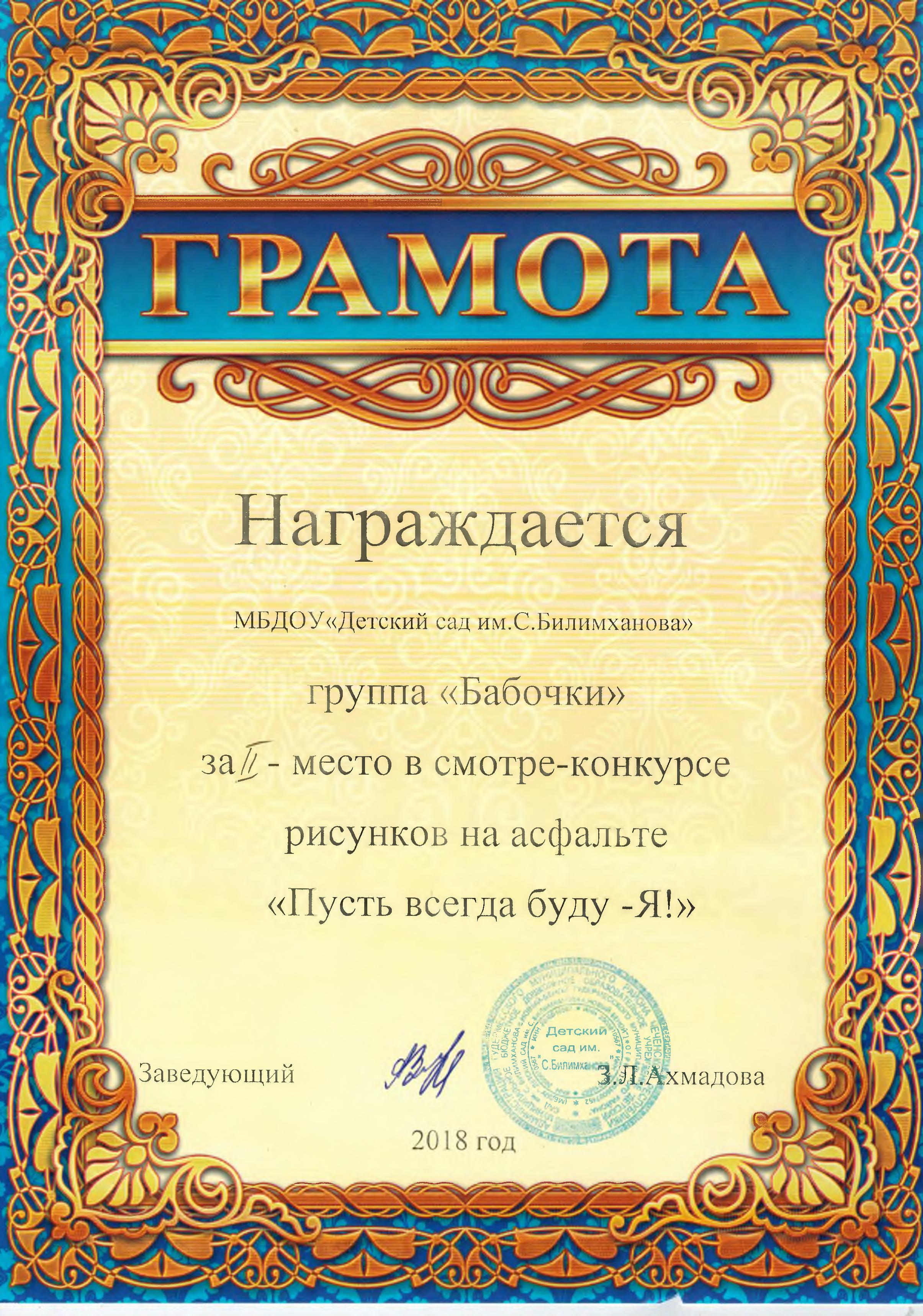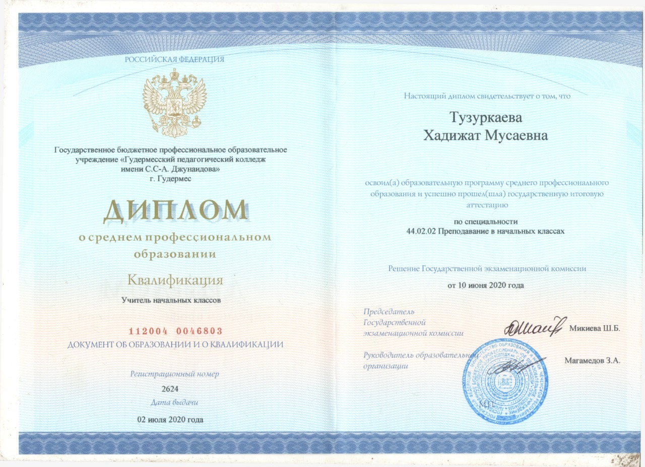 О себе Ф.И.О: Тузуркаева Хадижат Мусаевна Должность: воспитатель Стаж педагогической деятельности: 4 года Квалификационная категория: первая -23.10.2018г-прошла повышение квалификации в Негосударственном образовательном частном учреждении Дополнительного Профессионального Образования "Академия кадрового резерва" по дополнительной профессиональной программе "Педагогическая деятельность в рамках реализации государственного образовательного стандарта дошкольного образования" Эссе «Я - педагог» Скачать Работа с детьми Конспект ООД по познавательному развитию на тему: «Путешествие в сказку. Порядковый счет до 10» Скачать Конспект ООД по познавательному развитию на тему: «Путешествие по островам» Скачать Проект на тему: "Азбука Дорожного Движения"Скачать Работа с педагогами Мастер - класс с педагогами: «Создание мультфильмов в детском саду» Скачать Мастер - класс с педагогами: «Использование мнемотехник для развития речи детей» Скачать Мастер - класс с педагогамина тему: «Весёлая гусеничка» Скачать Работа с родителями Консультация для родителей на тему: "Безопасность детей — забота взрослых" Скачать Документы об образовании