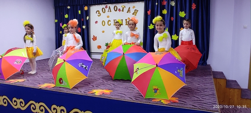 27.10.202027 октября в старшей группе "Сказка" прошло праздничное мероприятие "Золотая осень". Дети с нетерпением ждали этого мероприятия и очень серьезно к нему готовились: учили стихи, песни, танцы.Цель: Создать праздничную атмосферу, условия для тёплого, эмоционального общения детей.Задачи: 1. Закреплять знания и представления детей об осени.2. Развивать музыкальные и творческие способности детей с учётом возможностей каждого ребёнка с помощью различных видов музыкальной деятельности.3. Воспитывать любовь к природе.