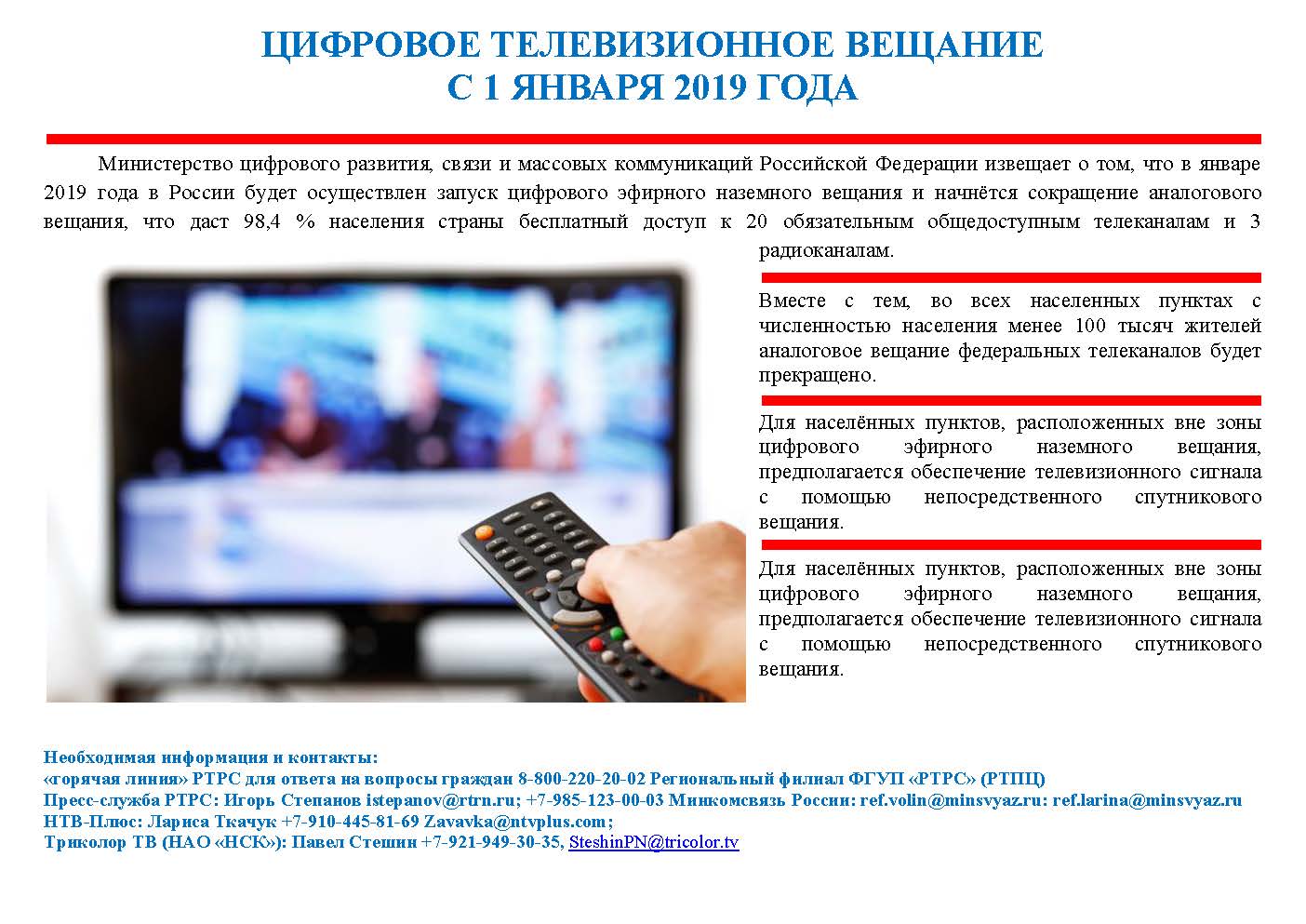 ЦИФРОВОЕ ТЕЛЕВИЗИОННОЕ ВЕЩАНИЕ С 1 ЯНВАРЯ 2019 ГОДА