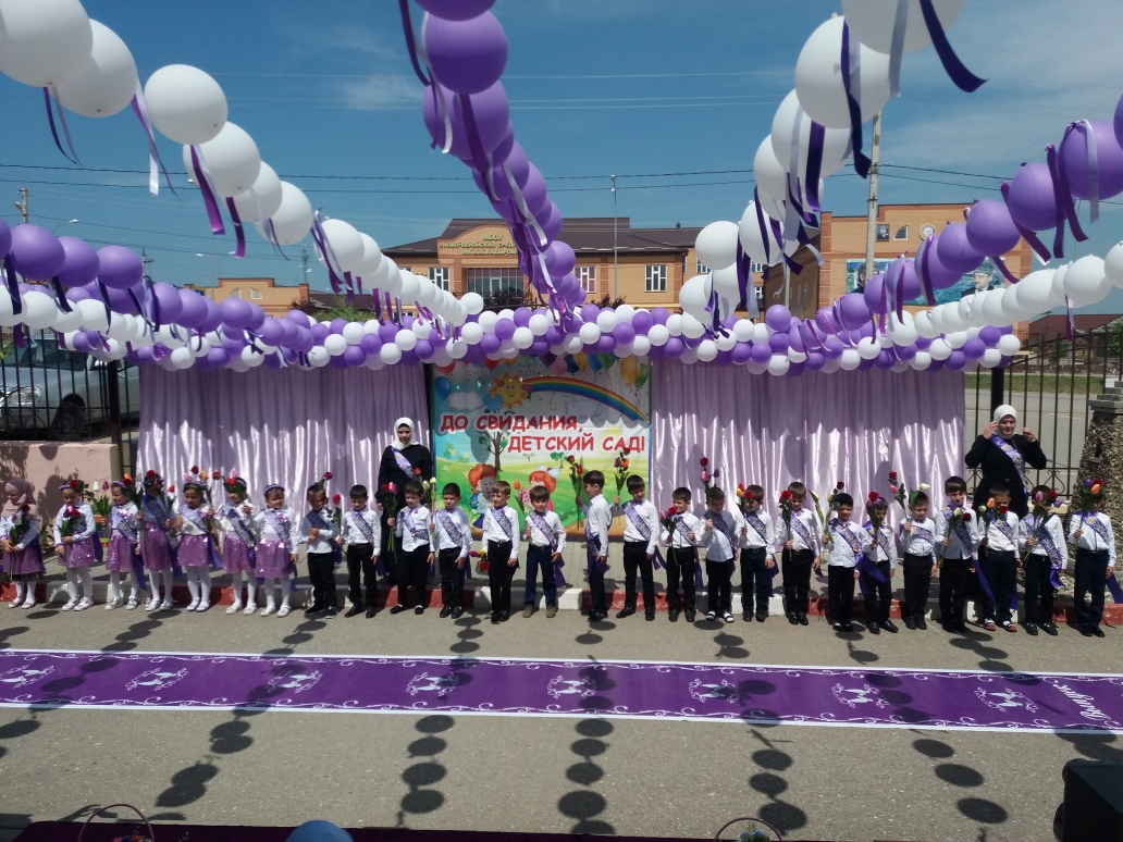 Двор детского сада был красочно украшен, фае здания было оформлено колокольчиками с фотографиями выпускников. Выпускники были празднично одеты в едином стиле, на них были ленты с надписью «Выпускник», а на руках белые, красные розы. Заведующий ДОУ Ахмадова Зара Лейчиевна вручила выпускникам дипломы выпускника детского сада, виньетки, а также активно участвовавшим в жизни детского сада родителям вручили благодарственные письма за помощь в воспитании подрастающего поколения.